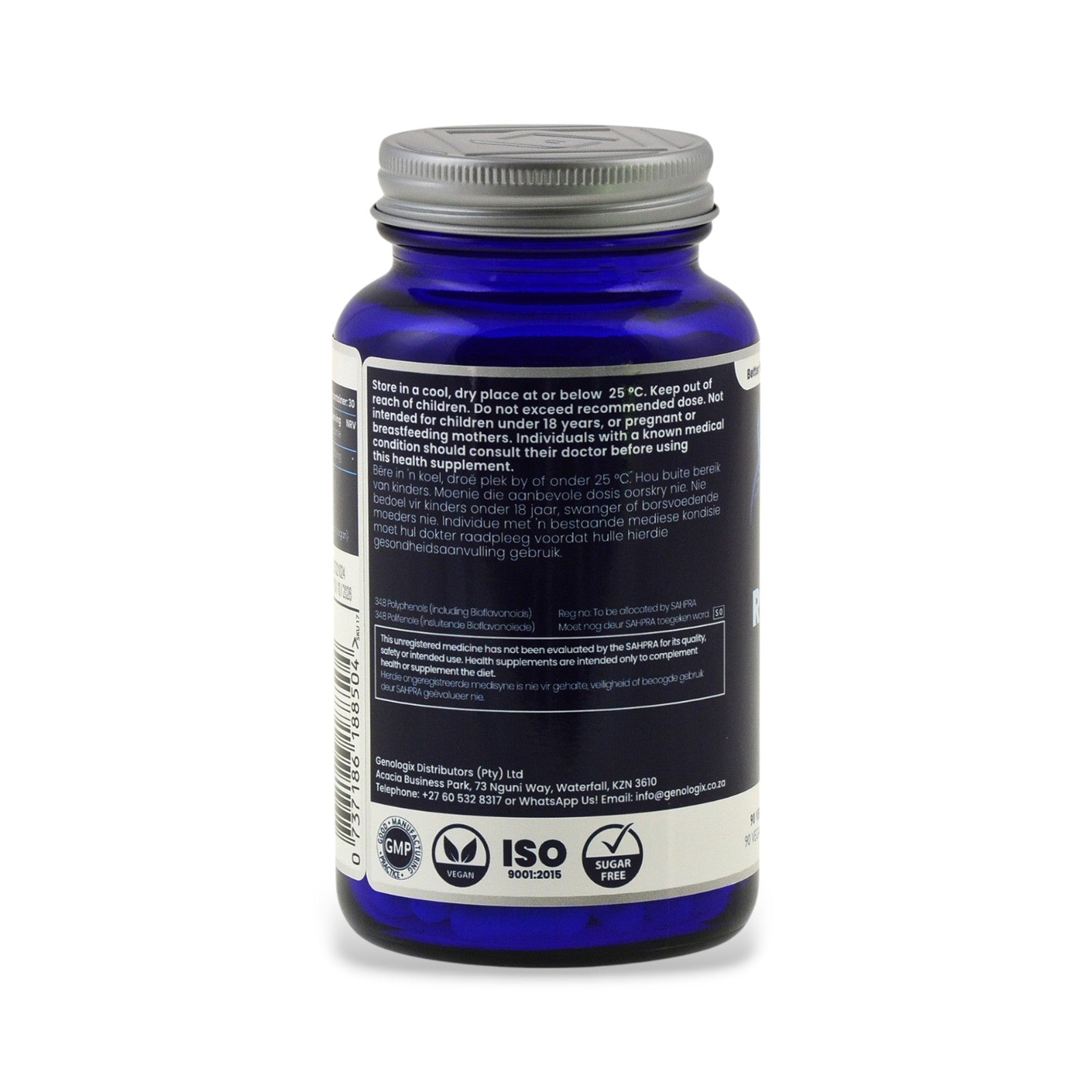 Genologix Trans-Resveratrol is a polyphenol that is a highly potent anti-oxidant, occurring naturally in low concentrations in foods such as red grapes, cocoa and blueberries. It is renowned for its longevity properties.